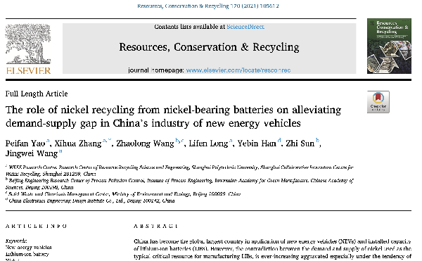【论文发表】The role of nickel recycling from nickel-bearing batteries on alleviating demand-supply gap in China’s industry of new energy vehicles