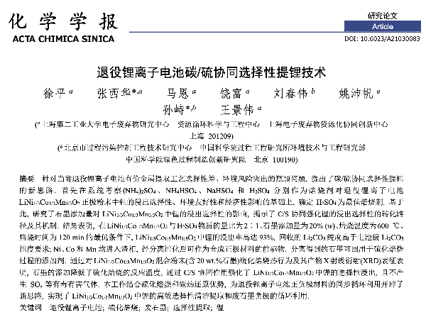 【论文发表】退役锂离子电池碳/硫协同选择性提锂技术