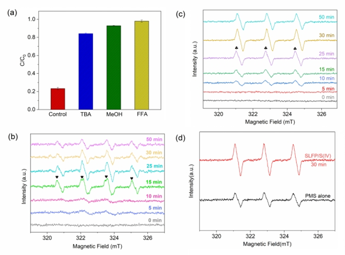 作者选择双酚S为模型污染物开展效果评估实验,研究发现SLFP/S(IV)体系在45 min内可以使得BPS的降解率达到80%(图1a)。同时发现,这种SLFP/S(IV)异相催化体系对亚甲基蓝(MB)、罗丹明B(RhB)和双酚A(BPA)等其它污染物也具有较好的去除能力(图1b)。