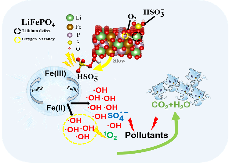 本研究报道了废弃动力电池磷酸铁锂材料可直接作为催化剂,用于活化亚硫酸盐(S(IV))催化去除水中有机污染物。 研究表明,废弃磷酸铁锂(SLFP)相比纯磷酸铁锂(PLFP),因其在充放电过程中产生锂缺陷和氧空位,有效活化亚硫酸盐产生硫酸根自由基、单线态氧和羟基自由基等氧化活性物种降解有机物。利用淬灭实验和电子顺磁共振(EPR)技术结合DFT理论计算揭示,溶液中氧气和亚硫酸氢根会快速吸附在有缺陷的SLFP表面生产表面配合物中间体,然后表面配合物缓慢分解生成过一硫酸根,紧接着过一硫酸根通过自分解或被表面二价铁活化分解生产活性氧化物种,实现有机污染物降解。