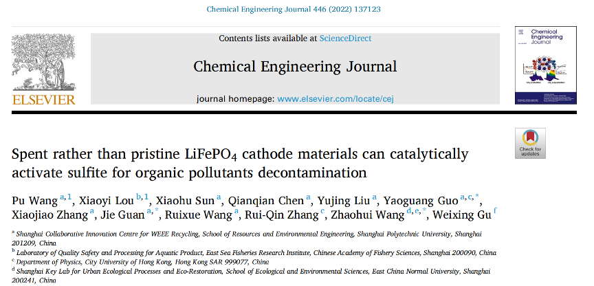 近日,公司关杰教授团队在国际工程技术领域TOP期刊《Chemical Engineering Journal》(中科院一区,2021 IF 16.744)上发表了题为“Spent rather than pristine LiFePO4 cathode materials can catalytically activate sulfite for organic pollutants decontamination”的研究论文。该论文以永利yl23411为第一单位,2019级硕士研究生王璞为第一作者,关杰教授、郭耀广副教授和华东师范大学王兆慧研究员为共同通讯作者。