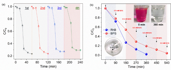 图4 四次循环降解BPS的降效果(a);直接拆解得到SLFP催化去除RhB的应用效果(b)