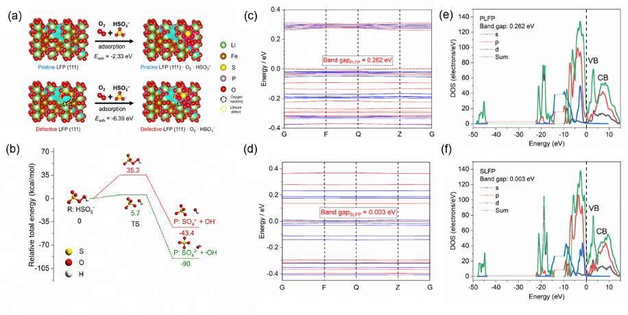 图3 DFT计算PLFP (111)和SLFP (111)表面对O2和HSO3-物种的吸附能(a);DFT计算从HSO5−到生成SO4•−和•OH的能量变化曲线(b);PLFP的能带结构(c);SLFP的能带结构(d);PLFP的态密度(e);SLFP的态密度(f)
