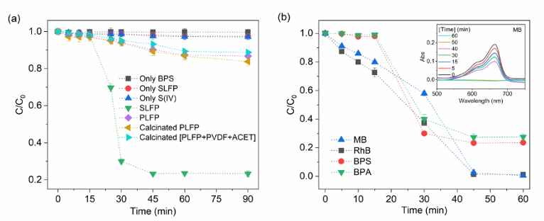 图1. BPS在不同体系的降解效果(a); SLFP/S(IV)对其它污染物的降解效果(b)