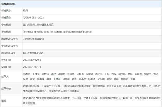 《氰化尾渣微生物处置技术规范(T/GRM088―2023)》该规范明确了微生物处置氰化尾渣技术的操作要求和标准,为相关企业和单位提供了科学、可行的指导。同时,通过微生物处置技术处理氰化尾渣,不仅可以减少环境污染,还可以降低处理成本,它推动了微生物处置技术的进一步发展和完善,提高了技术的可行性和效率。该规范的实施将促进微生物处置技术的广泛应用,推动相关产业的发展。同时,它也将为相关企业和单位提供更多的商业机会和发展空间。