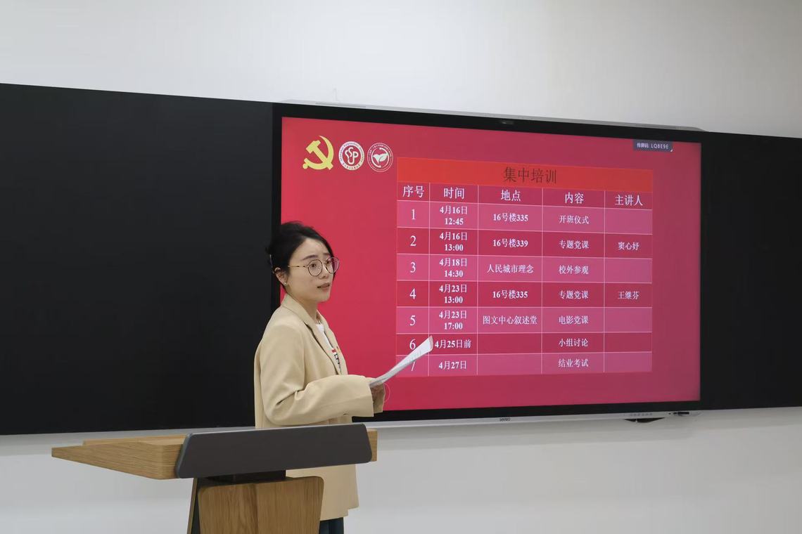 金慧明宣读本次培训班纪律,进一步加强入党积极分子在教育培训中的管理,严肃培训纪律,切实改进学风,学有实效。刘雪儿从培训班的具体安排、培训内容、考核方式等作出具体说明,希望同学们严格要求自己,保质保量完成学习任务。