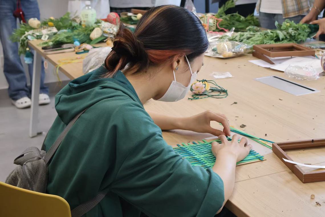 本次活动精心设计了多个富有民族特色的环节,结合绿色环保的专业特色,带领各民族同学制作非遗竹编、古法香囊、艾草门挂等手工作品,将民族技艺与青年创意结合,弘扬优秀传统文化。