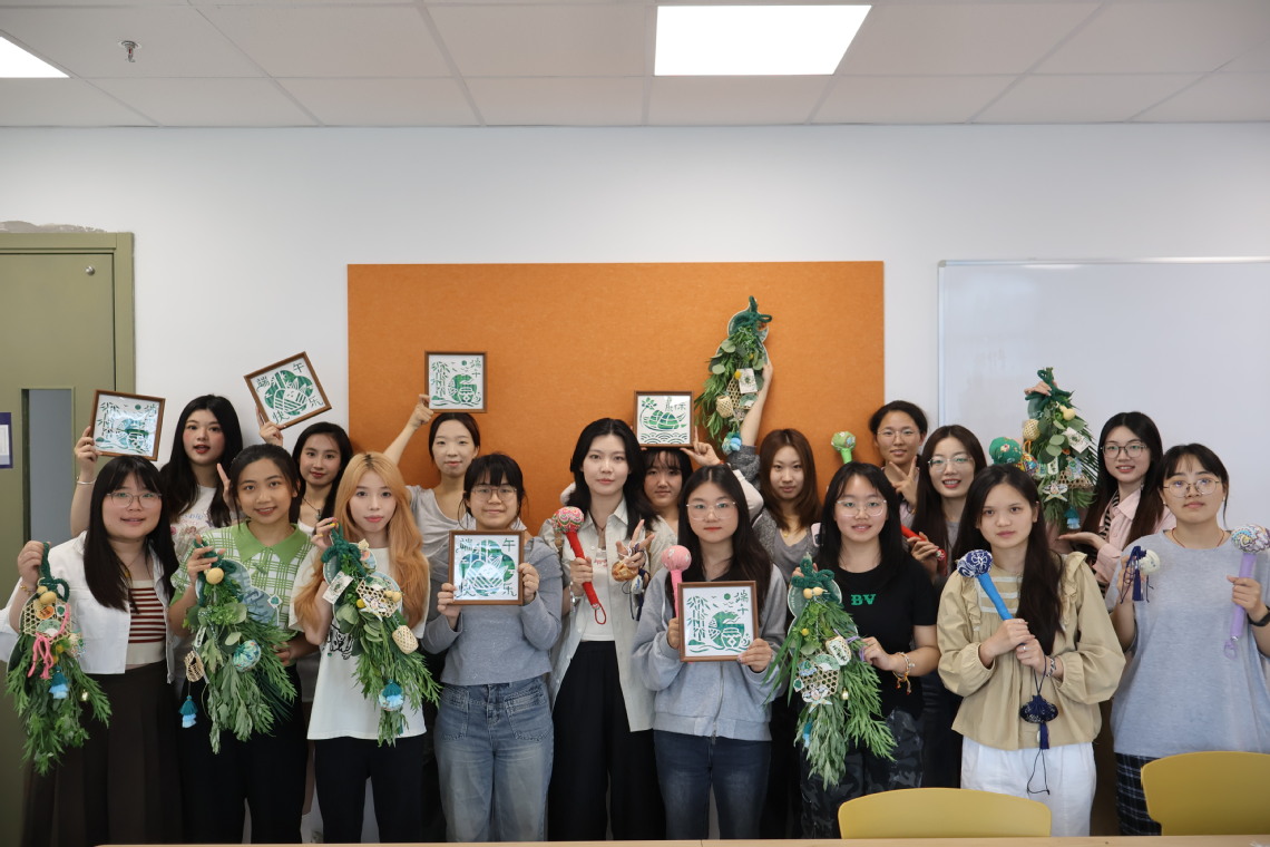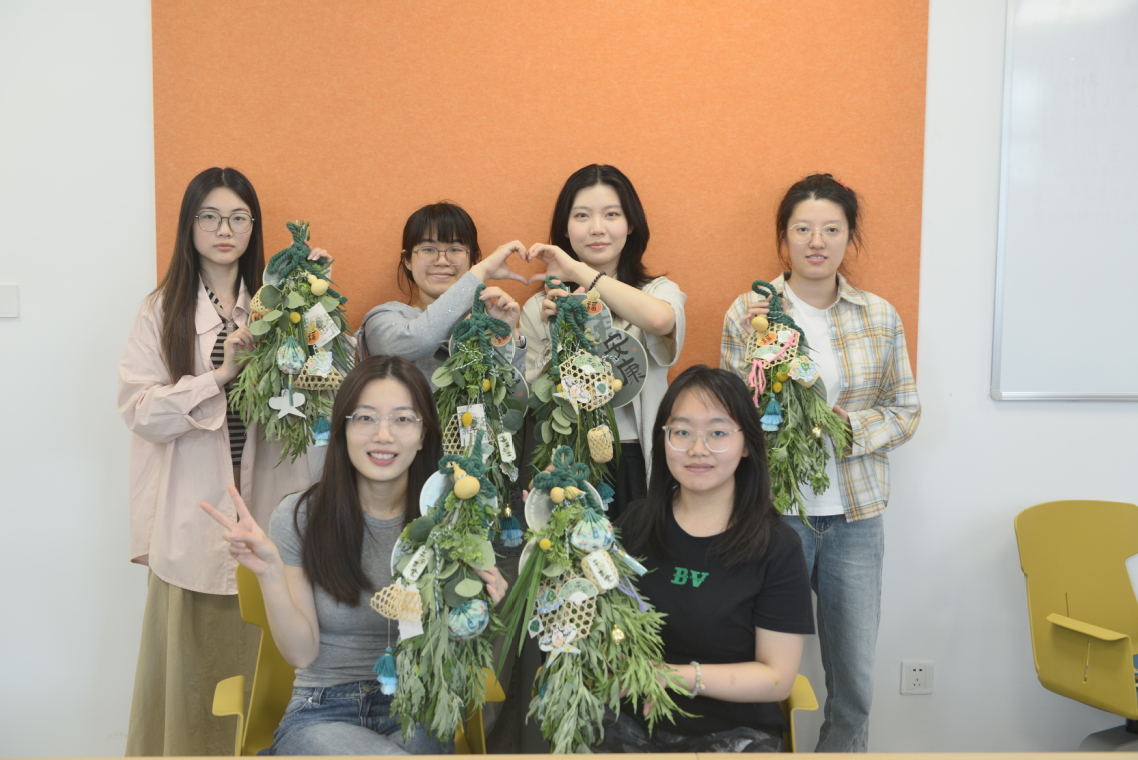 艾草锤和艾草门挂的制作同样人气爆棚。同学们分工合作,亲手将艾草制成艾草锤和门挂,既体验了传统手工艺,又了解到艾草的药用价值和文化内涵。现场弥漫着浓郁的草药香气,毕业和期末关键时期的压力,也在香味中得到了舒缓。