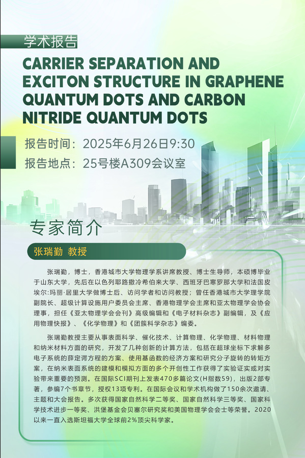学术报告预告丨CARRIER SEPARATION AND EXCITON STRUCTURE IN GRAPHENE QUANTUM DOTS AND CARBON NITRIDE QUANTUM DOTS