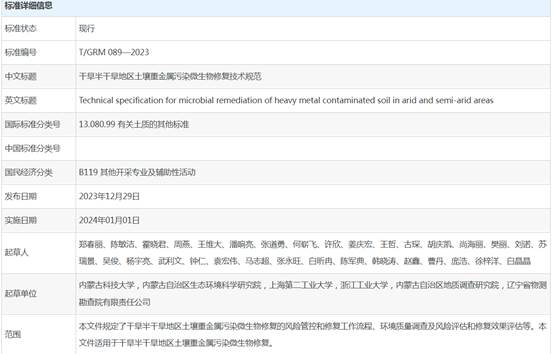 《Technical Specifications for MicrobialRemediation of Heavy Metal Contaminated soil in Arid and Semi-arid Areas(T/GRM089-2023)》: This technical specification providesa scientific basis for the microbial remediation of soil heavy metal pollutionin arid and semi-arid regions. It clearly defines the operational principles,technical requirements, and assessment criteria to be followed during theremediation process, making the remediation work more scientific andstandardized. The release of this specification is of significant importancefor environmental protection in arid and semi-arid regions, the development andinnovation of microbial remediation technology, the practical operationguidance for the remediation of heavy metal pollution in arid and semi-aridregions, and the development of related industries.