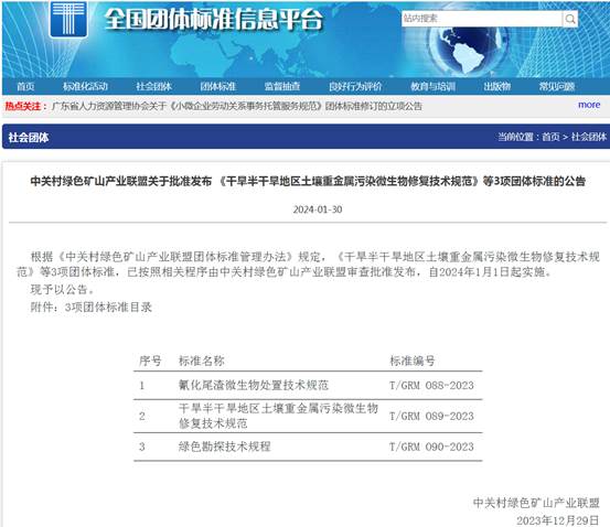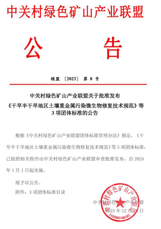 Professor Zheng Chunli from our institutetook the lead in drafting two group standards of the Zhongguancun Green MiningIndustry Alliance (T/GRM), which have been officially released recently. Theyare 《Technical Specifications for Cyanide TailingsMicrobial Disposal (T/GRM088-2023)》 and 《Technical Specifications for Microbial Remediation of Heavy MetalContaminated soil in Arid and Semi-arid Areas (T/GRM089-2023)》. Both of these group standards will come into effect on January 1,2024.